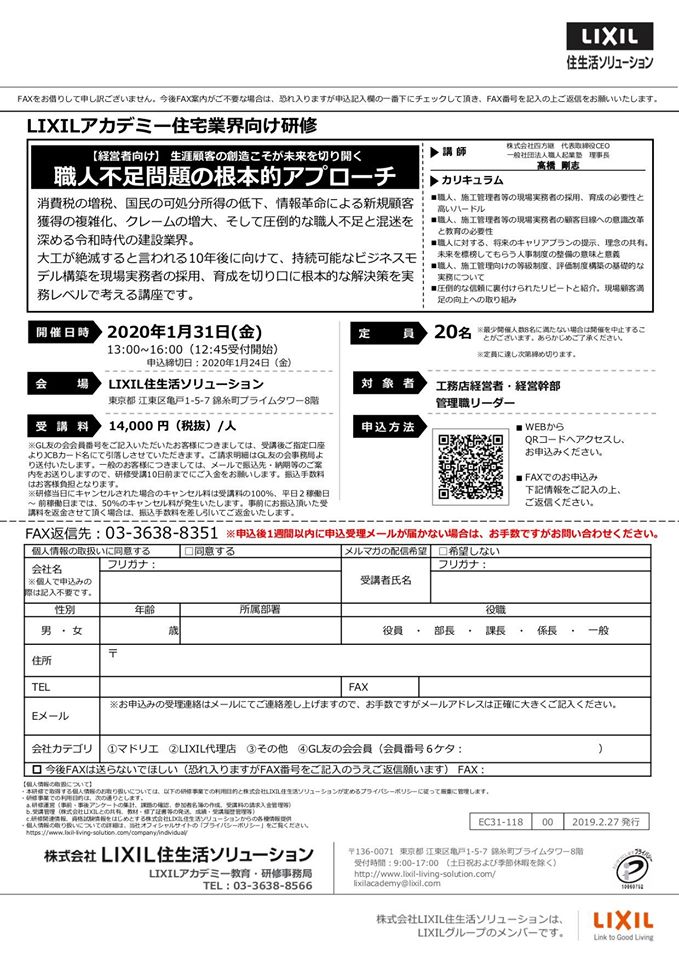 関西で取り組みをスタートする事業者が増えている、毎回、満員御礼のワークショップの内容を東京のLIXIL本社にて公開します。席に余裕があるとのことで直近の告知となりましたが、希少な機会なので、職人不足に危惧されている関東方面の方は是非お申し込み下さい。