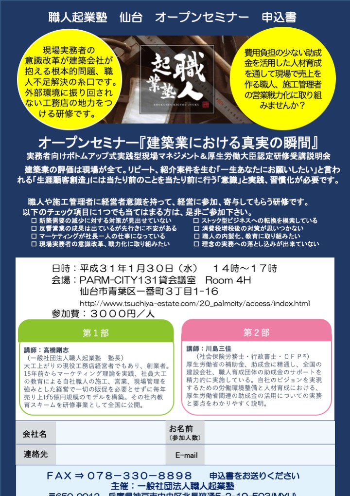 2019年1月30日(金) 職人起業塾 仙台 建築業における真実の瞬間」
