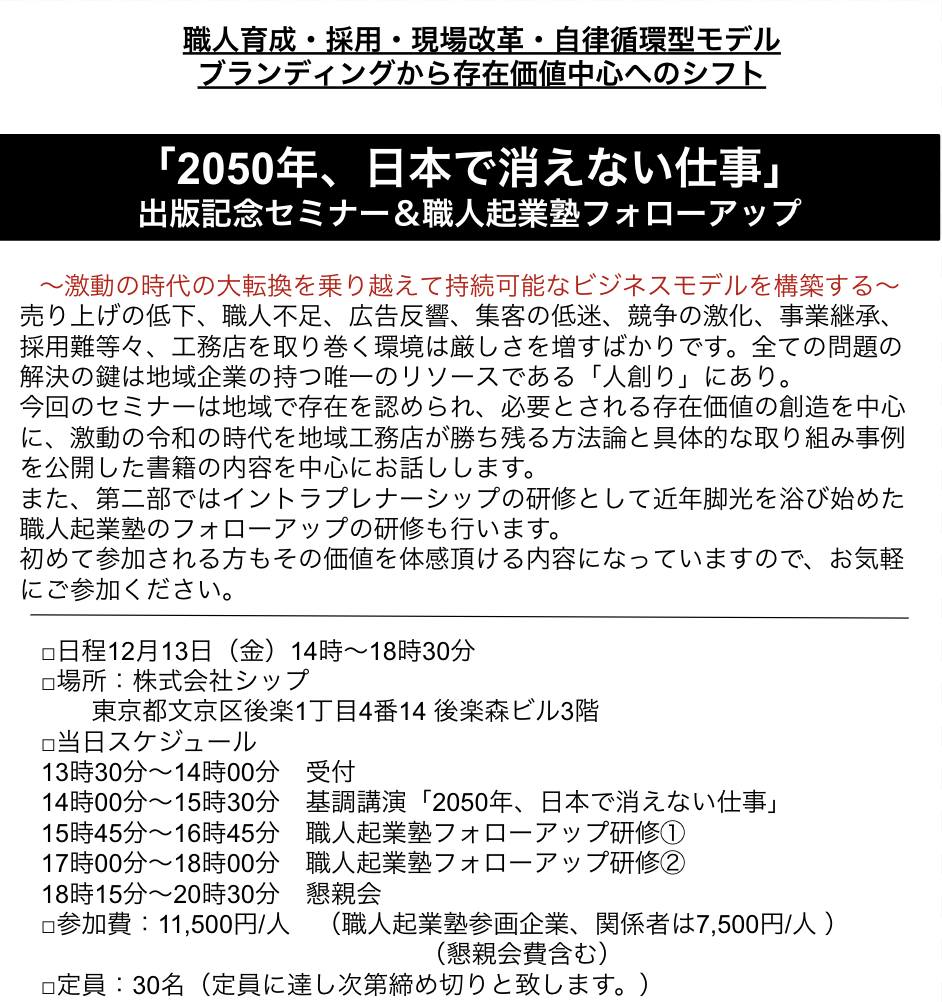 2024年12月13日(金) 「2050年、日本で消えない仕事」 出版記念セミナー&職人起業塾フォローアップ研修in東京
