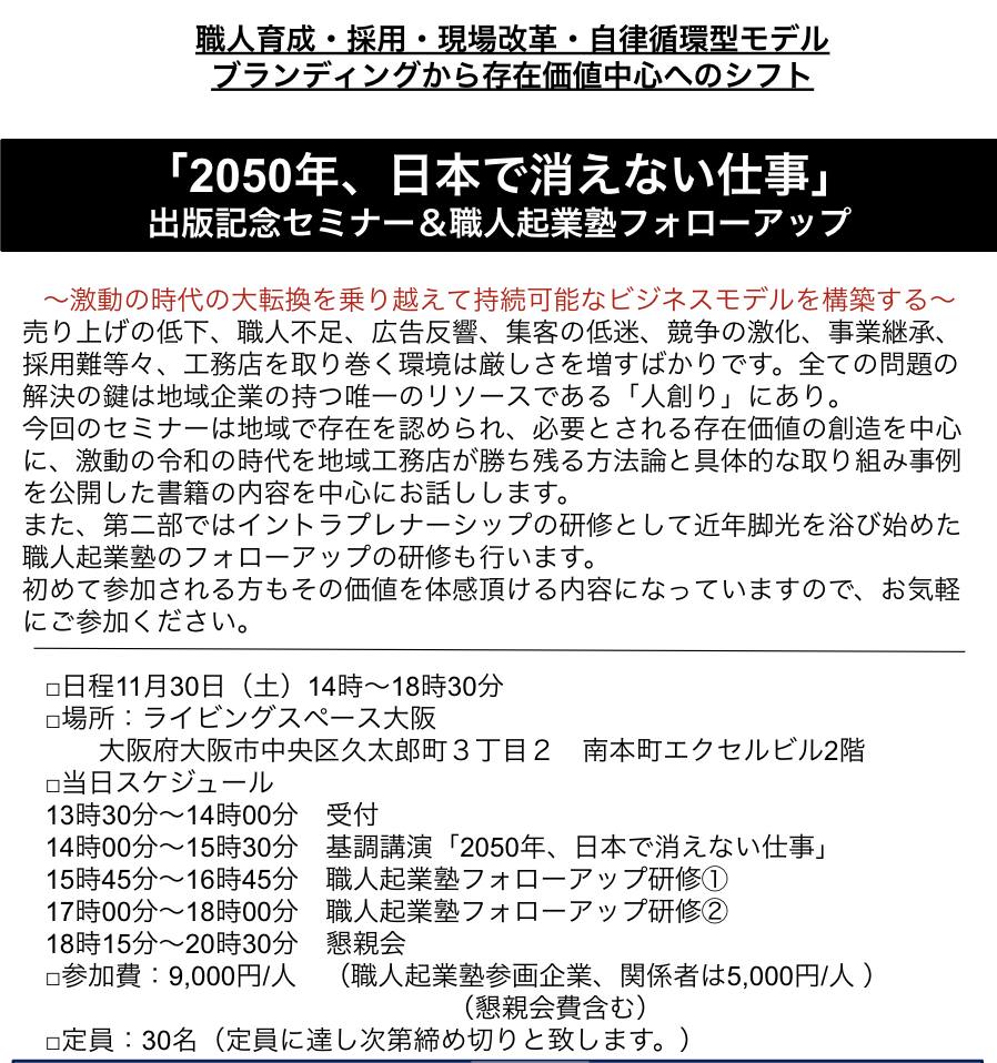 2024年11月30日(土) 「2050年、日本で消えない仕事」 出版記念セミナー&職人起業塾フォローアップ研修in大阪